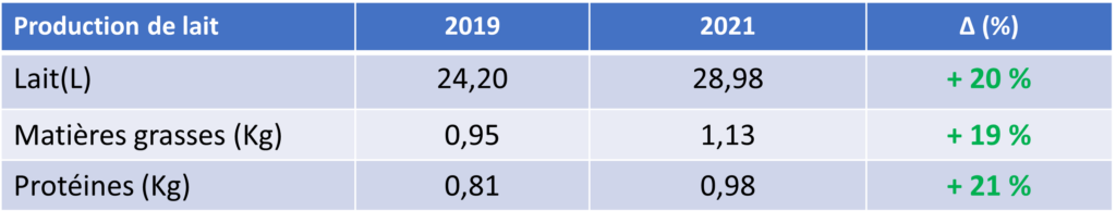 - Augmentation de 20% de la production de lait (et une augmentation proportionnelle des matières grasses et protéines)
