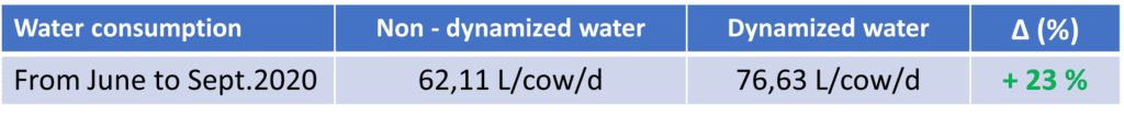 Eine vergleichende Beobachtung von 2 Gruppen von +/- 60 Kühen (Warzée-Farm in Hamois, Belgien) mit gleicher Menge und Qualität des Futters in Ställen das ganze Jahr über, von denen eine dynamisiertes Wasser trinkt und die andere nicht, führt zu Folgende Beobachtung: Die Gruppe, die dynamisiertes Wasser trinkt, sieht: