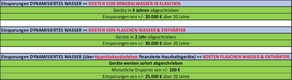 - Erhebliche Einsparungen werden beim Kauf von abgefülltem Wasser erzielt. Tatsächlich kostet Leitungswasser (das gefiltert und dynamisiert wird) 150 Mal weniger (~ € 0,004/L) als Mineralwasser in Flaschen (~ € 0,60/L)! Mit diesem Argument spart eine Familie von 5 Personen durch den Austausch der Flaschen gegen das Paket Biofilter + Biodynamizer mehr als 1.000 €/Jahr. Diese Geräte werden daher in weniger als 4 Jahren erstattet!