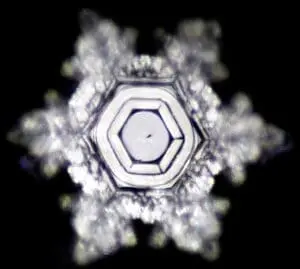 - Im festen Zustand (Schnee, Kristalle) können natürliche Wassercluster bis zu einigen hundert Wassermoleküle zählen (-> +/- 600 H2O-Moleküle; Quelle Thomas Zeuch am Institut für Physikalische Chemie in Göttingen, Deutschland Analyse der Schwingungsspektroskopie), die meistens um einen hexagonalen Kern herum organisiert sind, der von 6 Bäumen umgeben ist, die in fraktalen Vielfachen (symmetrische und redundante Überstrukturen), regelmäßig und harmonisch strukturiert sind (siehe Studie von Wasserkristallen).