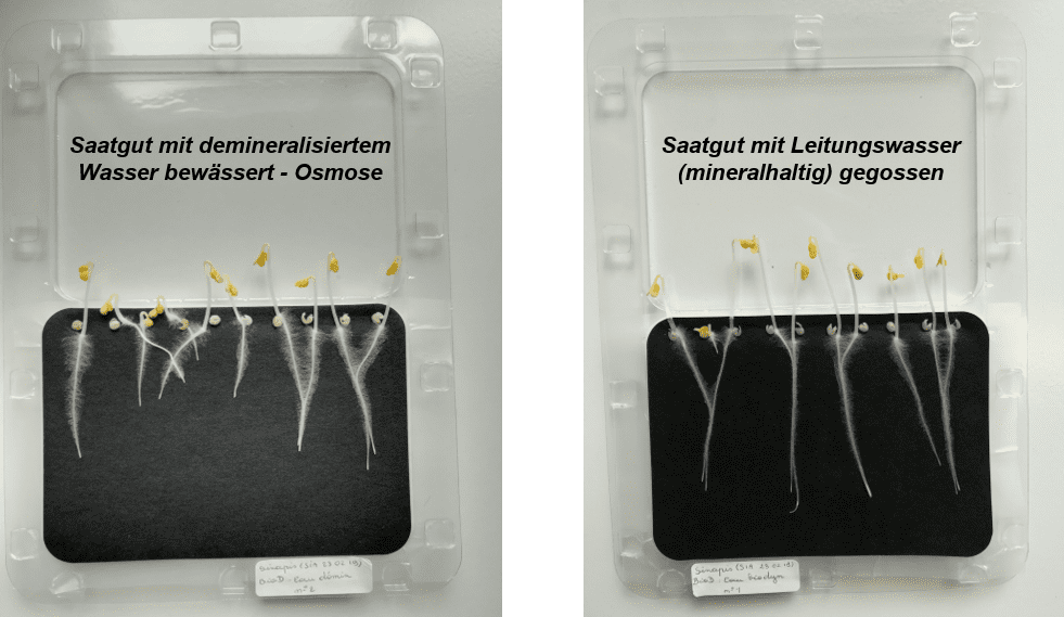 Nachfolgend sehen Sie den Unterschied in der Wurzelentwicklung zwischen Samen, die mit Umkehrosmosewasser Wasser (demineralisiertem) bewässert wurden, und Samen, die mit mineralhaltigem Leitungswasser bewässert wurden.