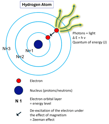 1.seine Elektronen, die mit bestimmten Frequenzen schwingen, werden durch Magnetismus exzitiert & de-exzitiert. Sie bewegen sich dann zu einer niedrigeren Orbitalelektronenschicht (näher am Kern) und setzen dabei Photonenenergie = Energiequant frei, und zwar proportional zur Energiedifferenz zwischen diesen beiden Ebenen (Zeeman-Effekt).