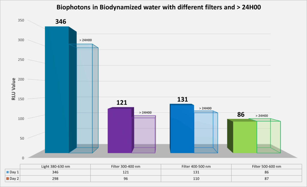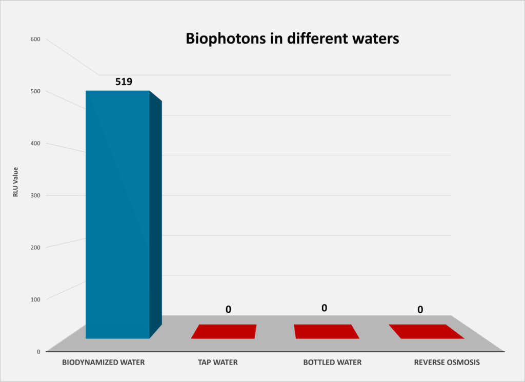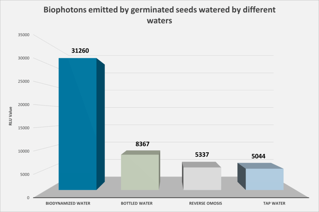 4) Es besteht eine Korrelation zwischen dem Energieniveau (Biophotonen) in biodynamisiertem Wasser und dem in gekeimten Samen: Mit biodynamisiertem Wasser gegossene gekeimte Samen emittieren sechsmal mehr Biophotonen (31.260 RLU/Sekunde/cm²) als solche, die mit anderen Wasserarten gegossen wurden. Letztere emittieren 73 % bis 84 % weniger Biophotonen! Dies belegt, dass die energetische Qualität des biodynamisierten Wassers auf den Organismus übertragen wird. Es deutet zudem darauf hin, dass die biophotonische Strahlung aus der biochemischen Aktivität des Samens durch die biophotonische Emission des biodynamisch behandelten Wassers ergänzt und verstärkt wird. Dies ermöglicht eine höhere funktionelle Vitalität der biologischen Prozesse der Pflanze.