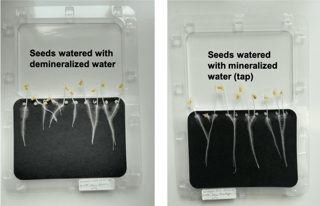 See below the difference in root development between seeds watered with reverse osmosis water (demineralized) and seeds watered with tap water containing minerals.