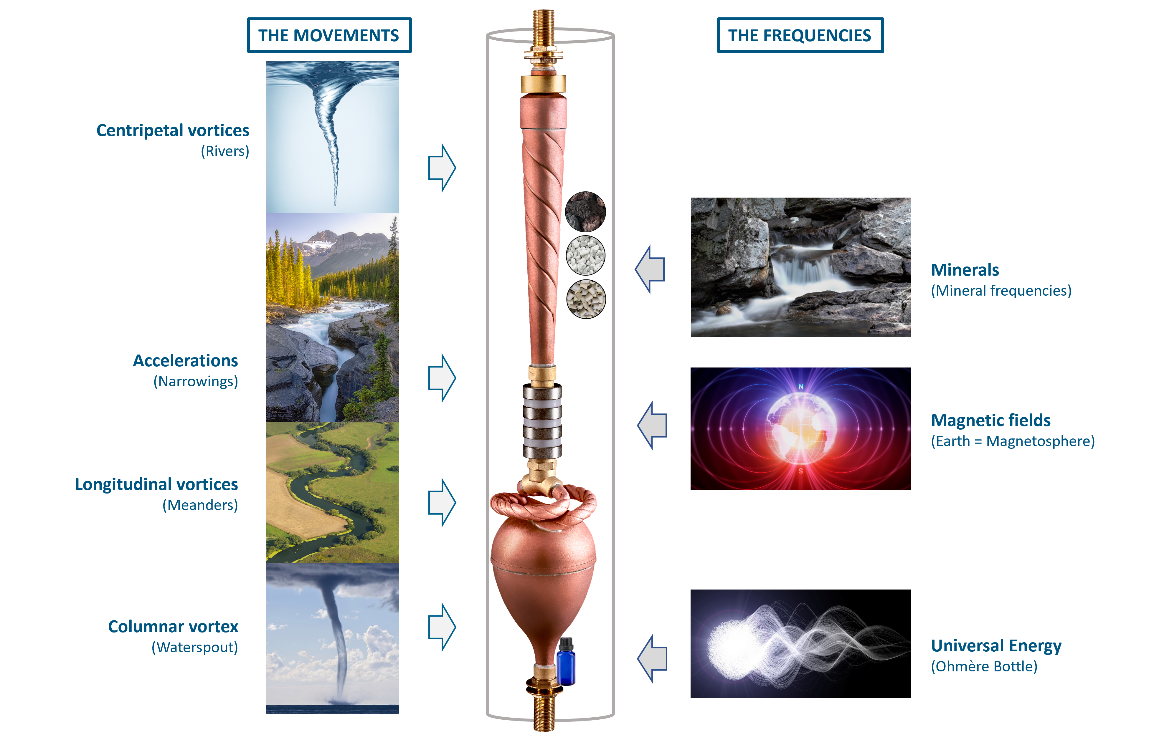 The natural flow of water which is reproduced by the forms of the Biodynamizer borrows from nature the following movements: