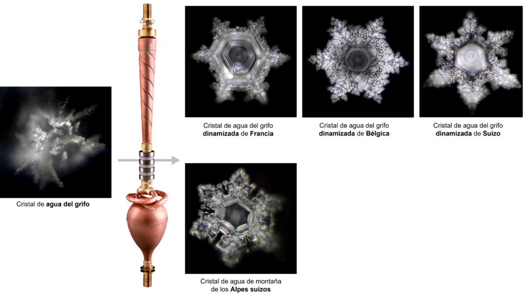 Meta : Observe la estructura de las moléculas de agua congeladas por cristalización y compare esta estructura según diferentes tipos de agua (dinamizada y no dinamizada); este método es indicativo e ilustrativo; estos experimentos no constituyen una prueba científica; sin embargo, estas observaciones deben estar vinculadas al análisis científico de «residuos secos estructurados por la energía del agua» realizado por el Prof. Bernd Kröplin (Universidad de Stuttgart, Institut für Thermodynamik der Luft- und Raumfahrt, en 2016)