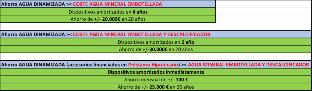 • Se hacen ahorros significativos en la compra de agua embotellada. De hecho, el agua del grifo (que será filtrada y dinamizada) cuesta 150 veces menos (~ 0,004 euros/litro) que el agua mineral embotellada (~ 0,60 euros/litro)! Con este argumento, al sustituir los frascos por el paquete Biofilter + Biodynamizer, una familia de 5 personas ahorrará más de 1.000 euros al año). Estos dispositivos son por lo tanto reembolsados en menos de 4 años!