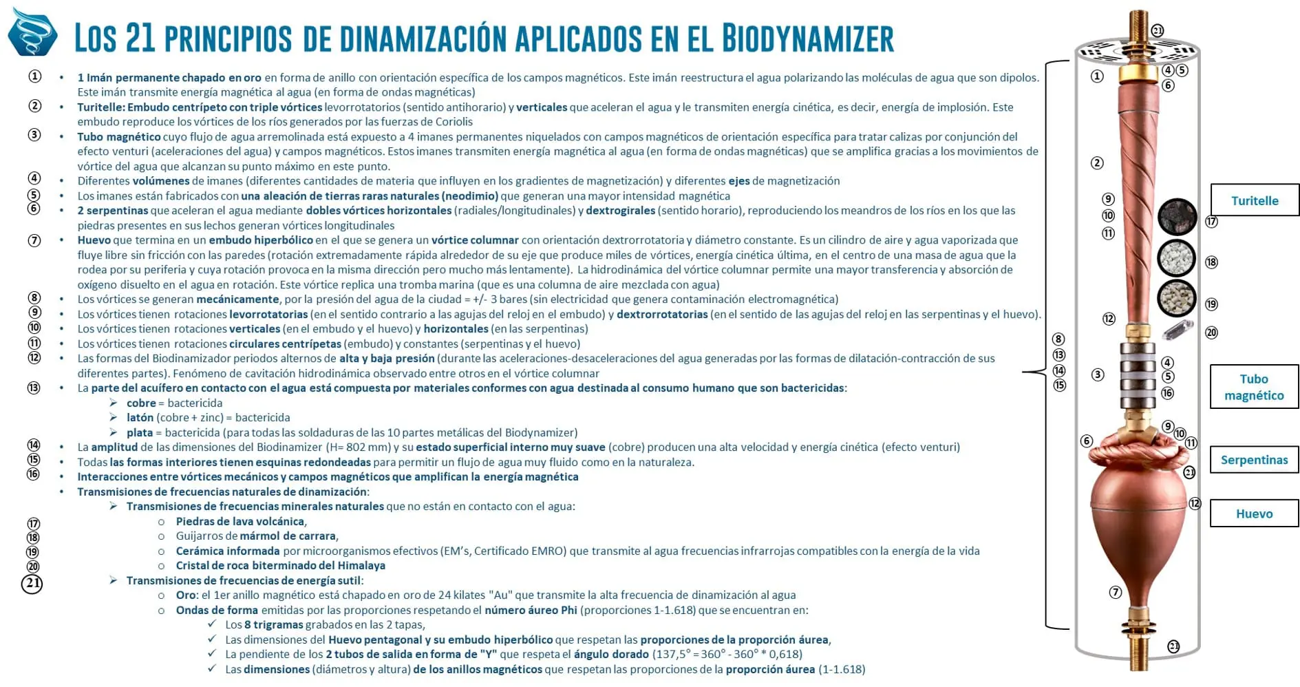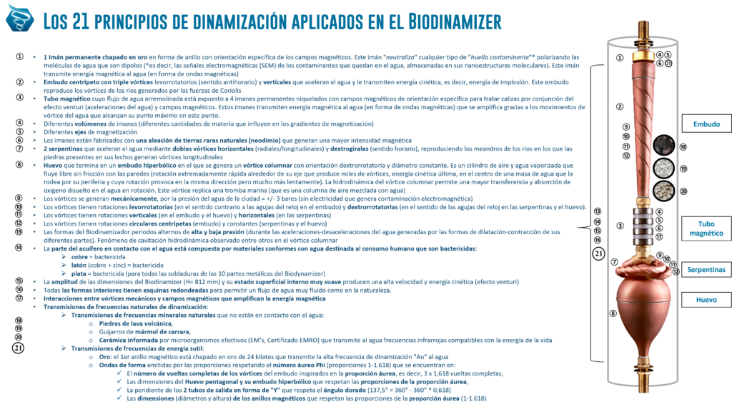 Mecanismo: Se aplican 21 principios de dinamización, incluyendo vórtices mecánicos y campos magnéticos + transmisión de frecuencia natural.
