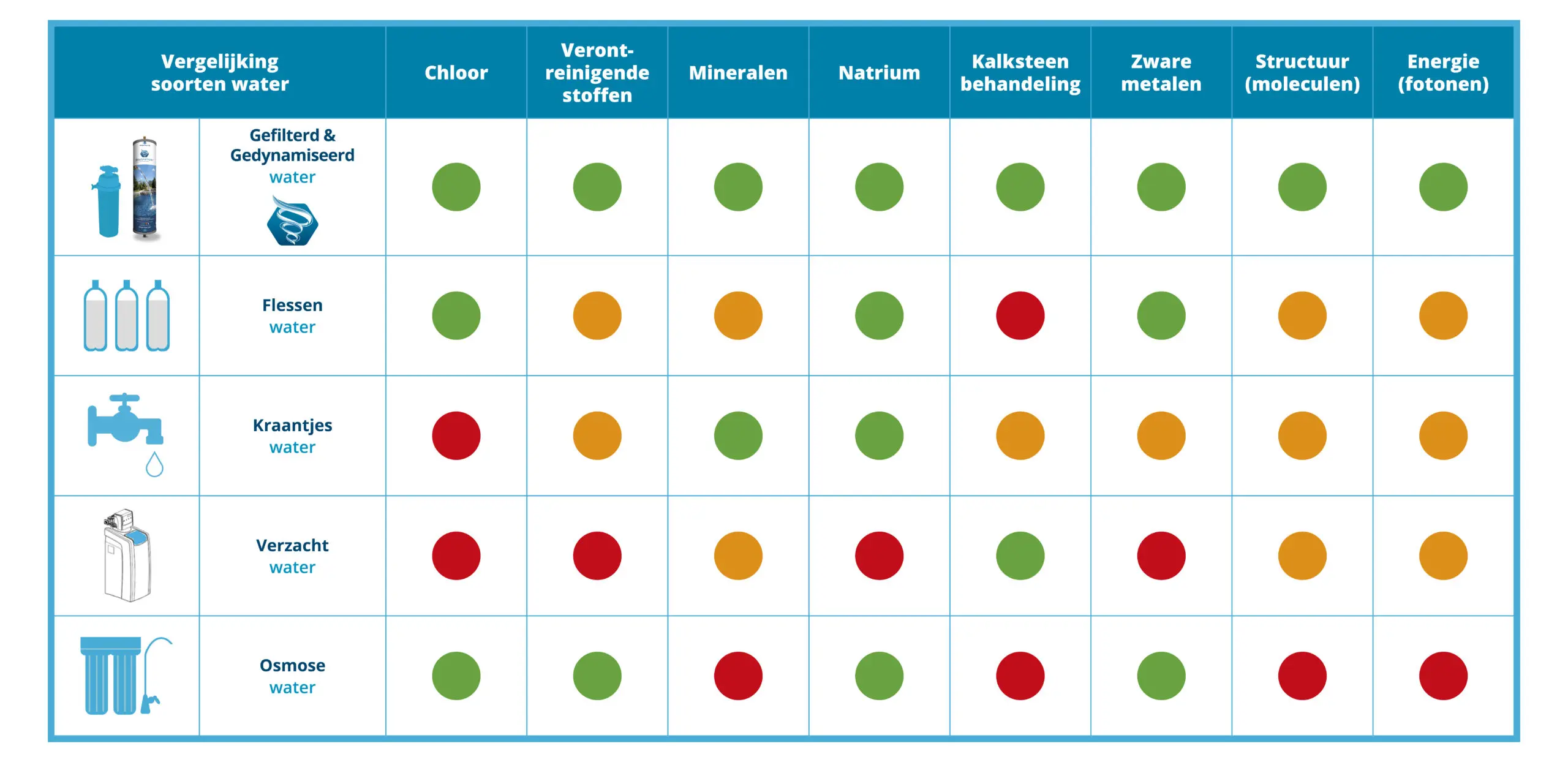 - de meeste vervuilende stoffen die nog aanwezig zouden zijn in leidingwater (chloor, slechte smaken en geuren, corrosie van leidingen, bacteriën, organische pesticiden, PFAS-stoffen, zware metalen, enz.)
