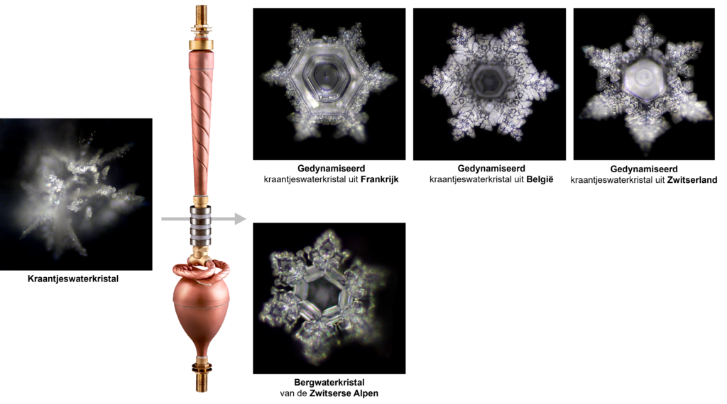 Vergelijking van een kristal van onbehandeld kraanwater> <3 kristallen van gedynamiseerd water uit 3 verschillende landen (Rhode St. Genèse in België, Brens in Frankrijk & Uttigen in Zwitserland): gedynamiseerd water geeft vaak prachtige zeshoekige waterkristallen die de uitdrukking kunnen zijn van de energie die het bevat!