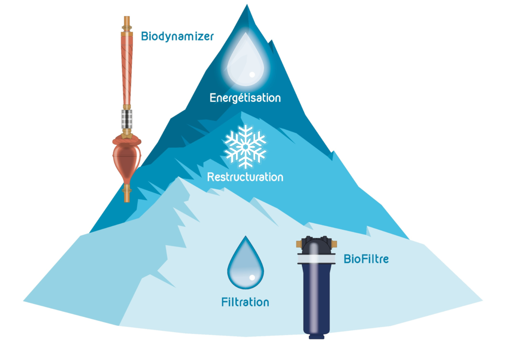 Pour bénéficier d’une eau vive telle qu’on la retrouve dans la nature, il convient de la filtrer (Biofiltre), ensuite de la restructurer (Biodynamizer), et enfin de l’énergétiser (Biodynamizer).