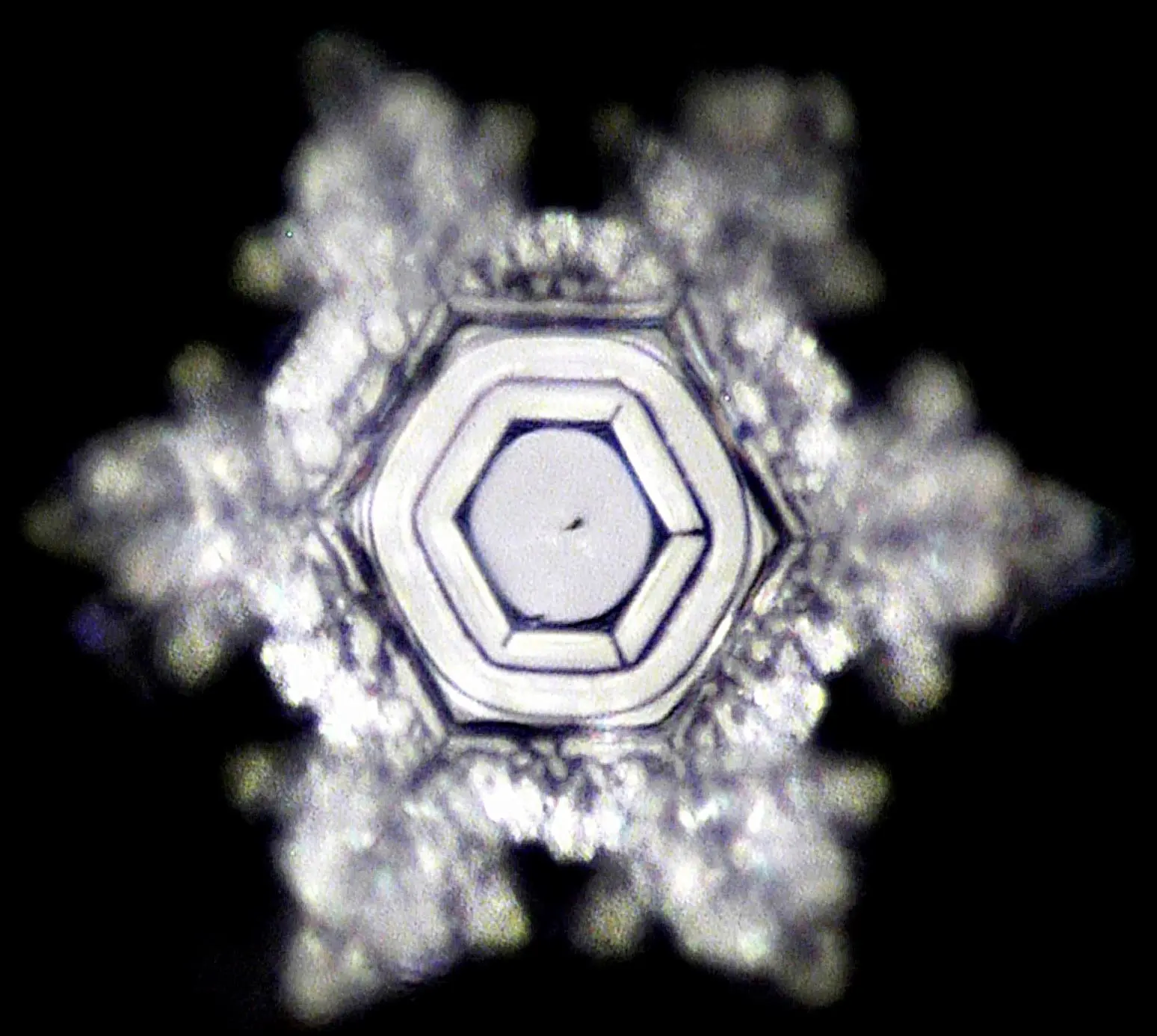 - A l’état solide (neige, cristaux), les clusters d’eau naturels peuvent compter jusqu’à quelques centaines de molécules d’eau (-> +/- 600 molécules H2O ; source Thomas Zeuch at the Institut für Physikalische Chemie in Göttingen, Germany analyse de spectroscopie vibrationnelle) organisées le plus souvent autour d’un cœur hexagonal entouré de 6 arborescences structurées en multiples fractales (superstructures symétriques et redondantes), régulières et harmonieuses (voir étude des cristaux d’eau).
